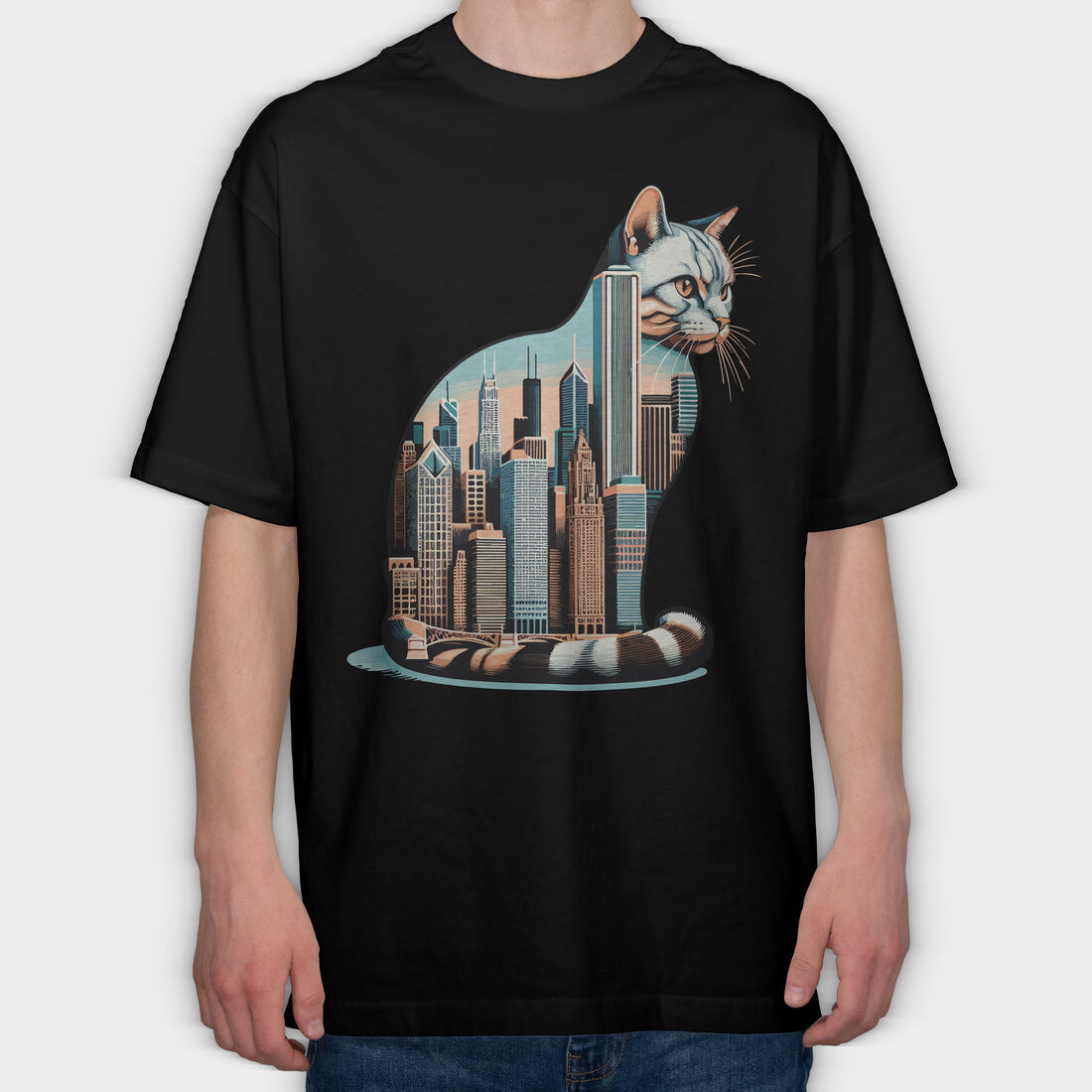 Chicago Skyline Cat, Tricou Oversize Barbati (Unisex)