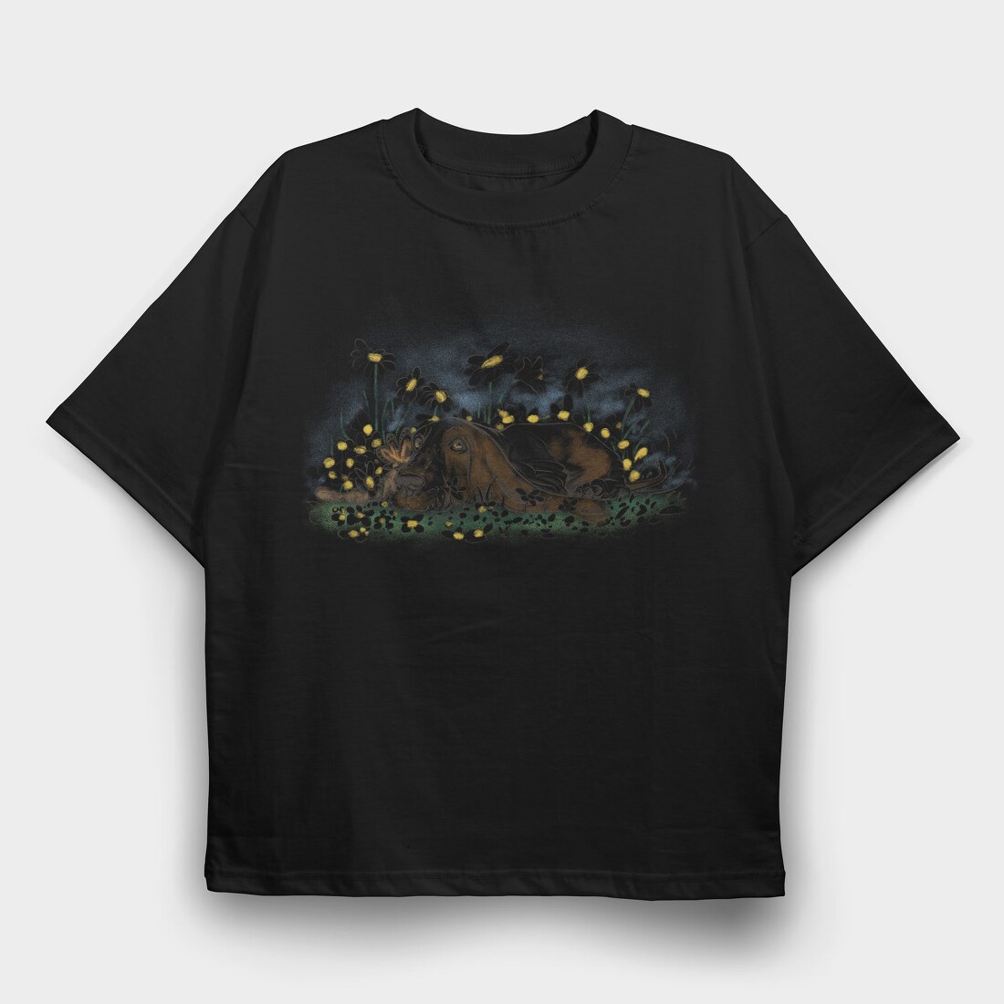 Dog On Flower Field Lying, Tricou Oversize Barbati (Unisex)