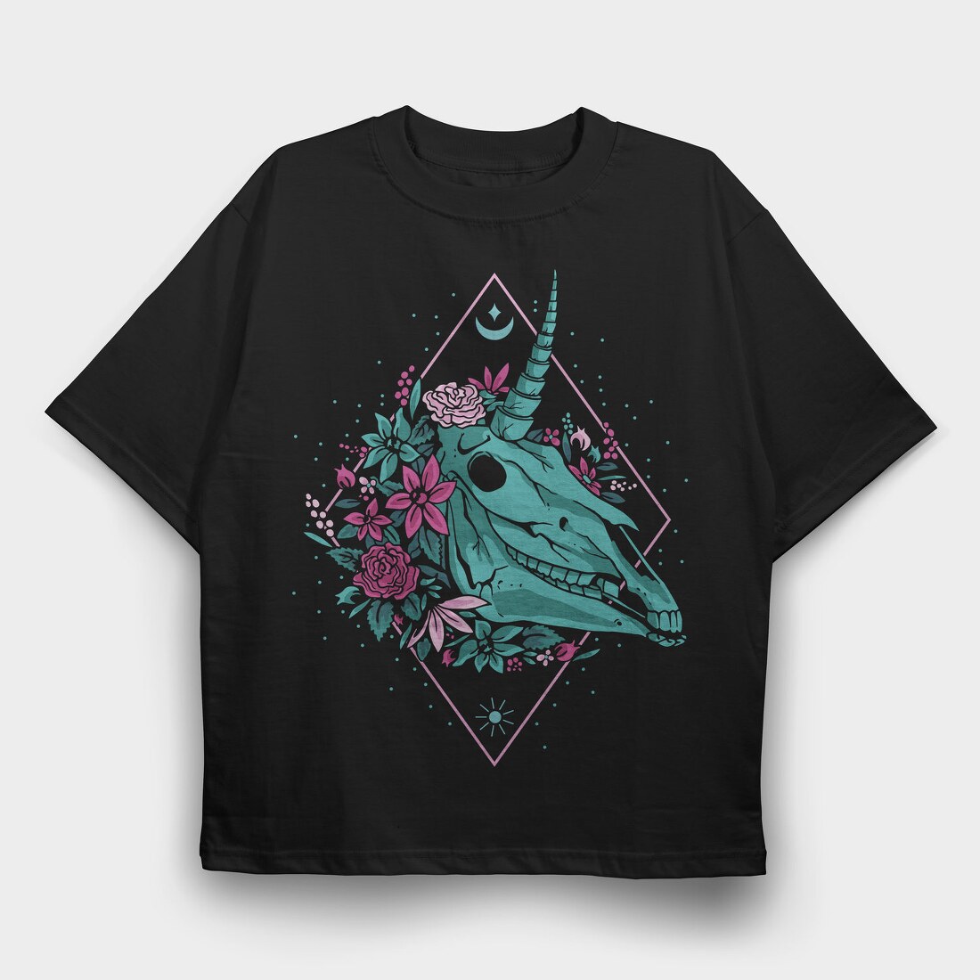 Skull Unicorn Head With Flowers, Tricou Oversize Barbati (Unisex)