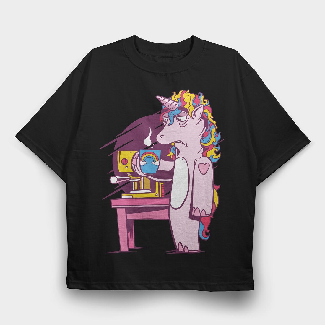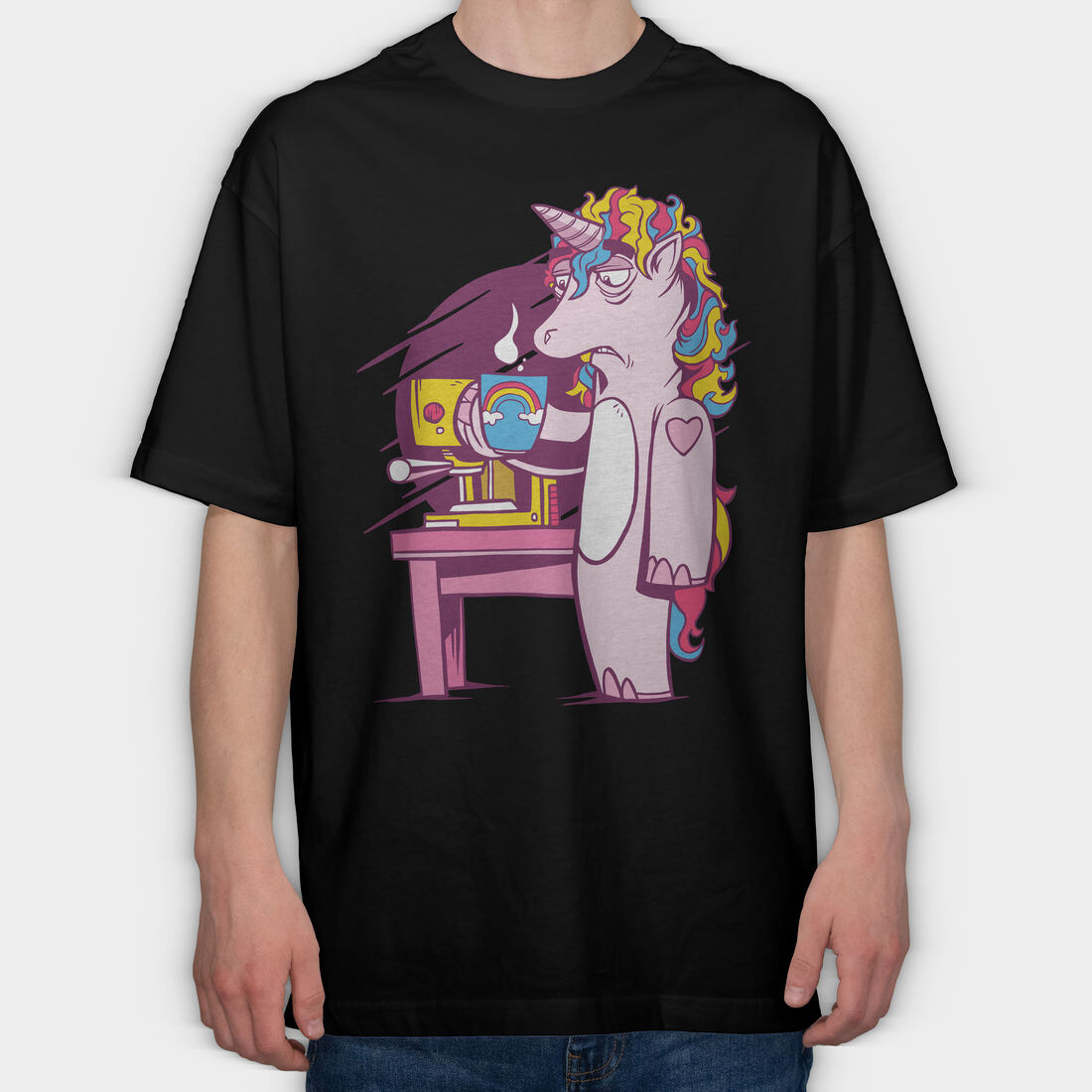 Tired Unicorn With Coffee, Tricou Oversize Barbati (Unisex)