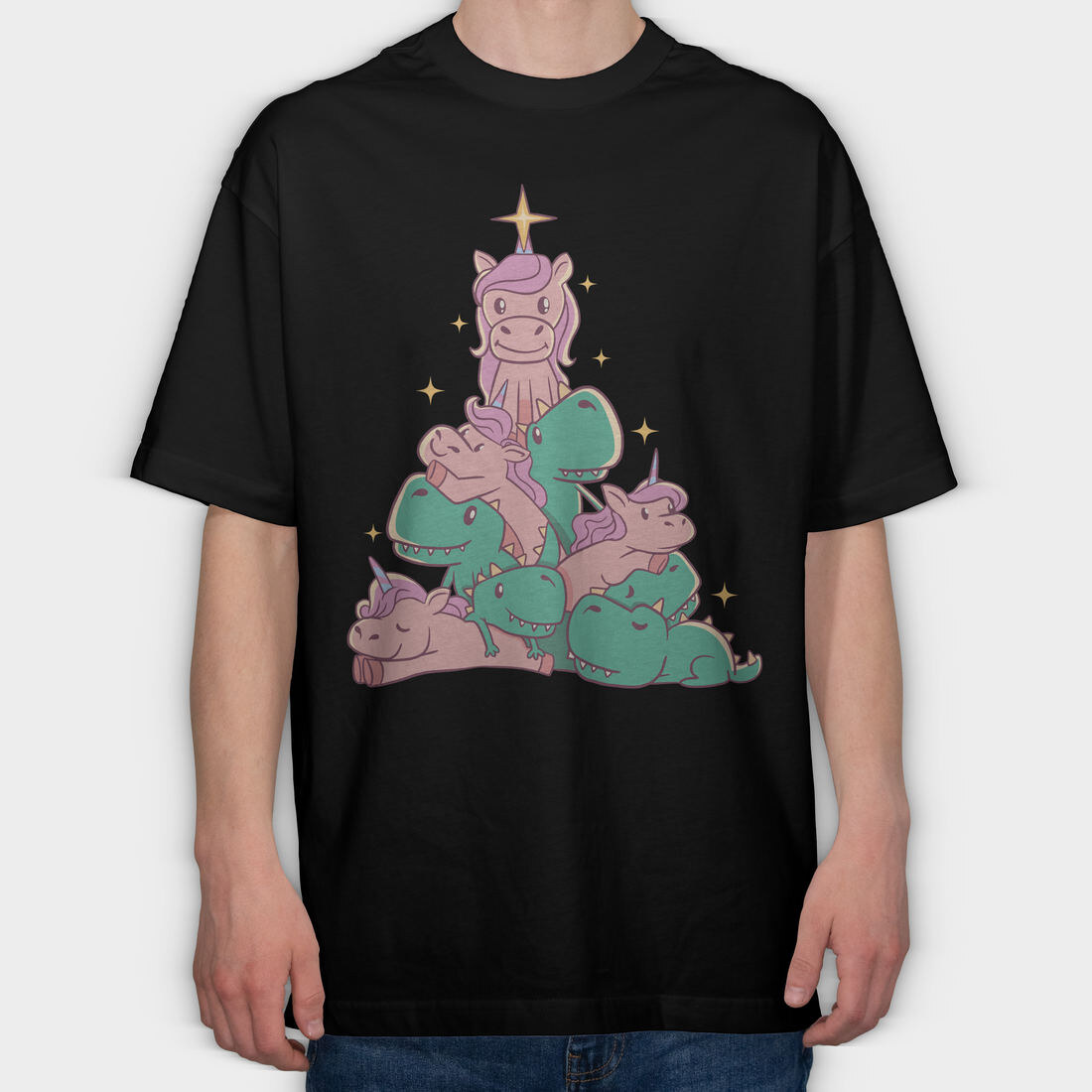Unicorns And T Rex Christmas Tree, Tricou Oversize Barbati (Unisex)
